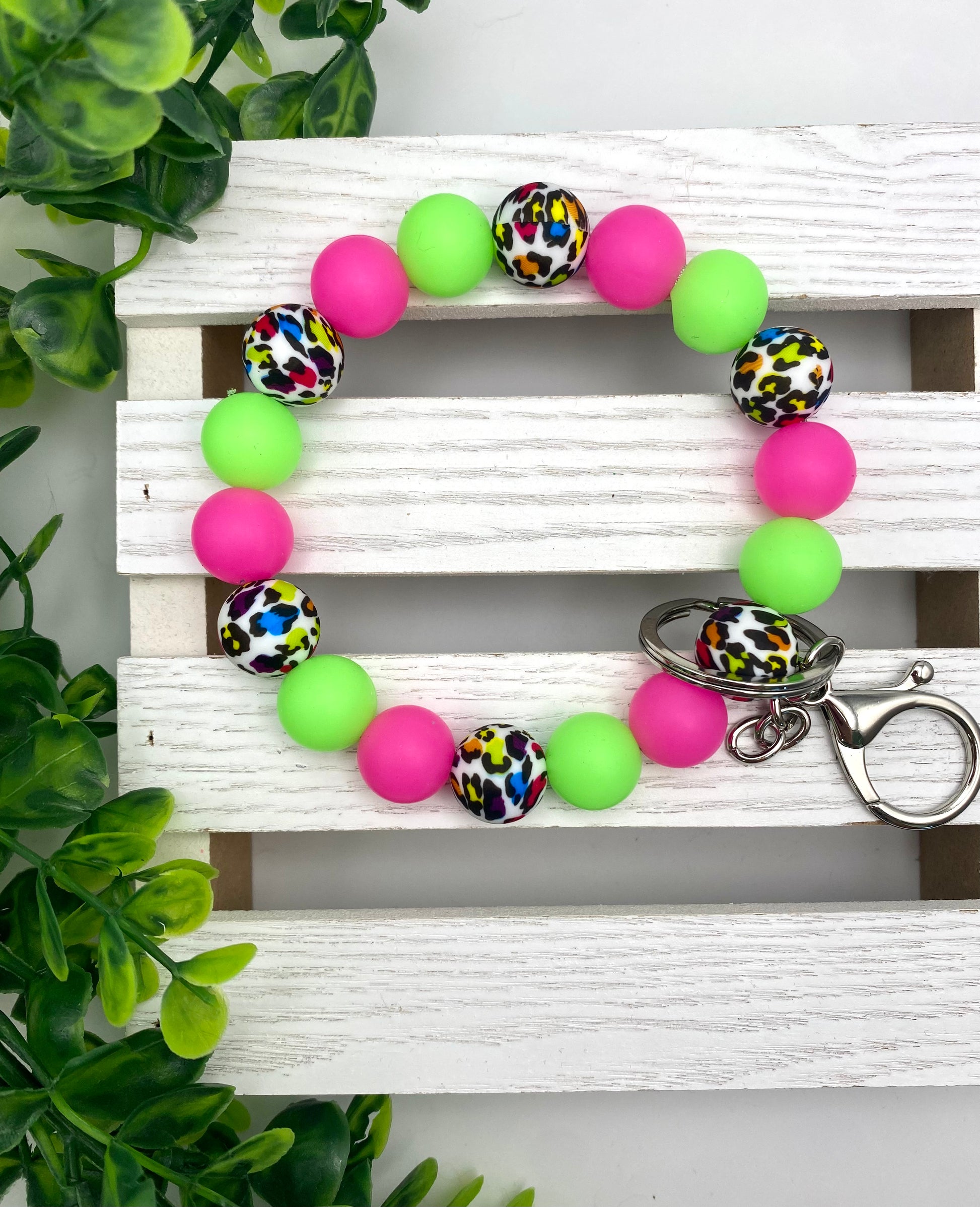 Colorful and trendy wristlet with leopard accents.